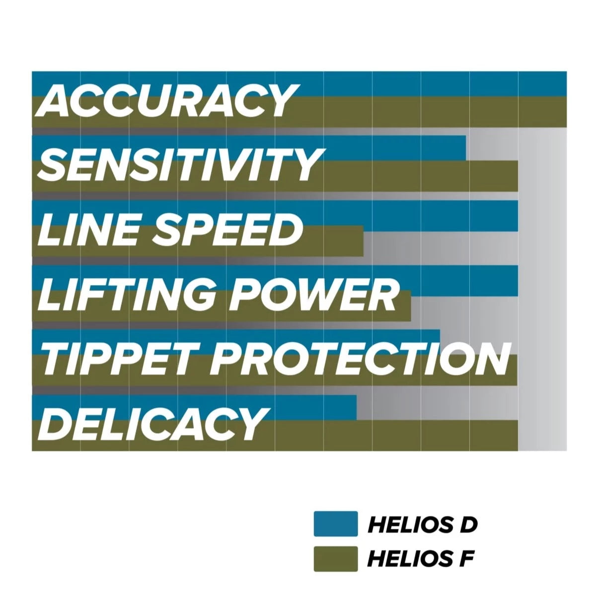 A graphic showing the Vertical and Horizontal Tip Displacement of the new Helios Fly Rod versus competitors' fly rods.