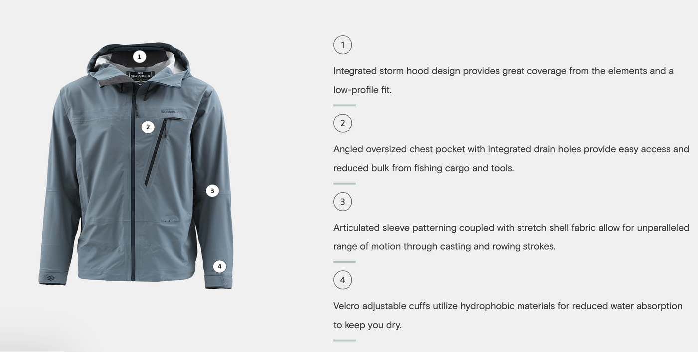 {"id":8752363929833,"title":"Skwala Carbon Jacket Storm","handle":"skwala-carbon-jacket-storm","description":"\u003cp\u003e\u003cstrong\u003e\u003ciframe title=\"YouTube video player\" src=\"https:\/\/www.youtube.com\/embed\/BpxDKqkOBK0\" height=\"315\" width=\"560\" allowfullscreen=\"\" allow=\"accelerometer; autoplay; clipboard-write; encrypted-media; gyroscope; picture-in-picture\" frameborder=\"0\"\u003e\u003c\/iframe\u003e\u003c\/strong\u003e\u003c\/p\u003e\n\u003cp\u003e\u003cstrong\u003eMade for anglers who have to see what’s around the next bend, the Carbon Jacket’s fully waterproof, four-way stretch shell will keep you dry without slowing you down.\u003c\/strong\u003e\u003c\/p\u003e\n\u003cp\u003eBuilt for anglers who demand flexibility and dexterity but aren’t willing to sacrifice comfort, the Carbon Jacket is fully waterproof, truly breathable, and easily packable. Though designed to pair with our Carbon Waders, this shell stands alone—weighing less than a pound and featuring a four-way stretch hard-shell outer layer that moves unlike anything you’ve ever worn. Whether you travel across the globe, or just higher up your local creek than most are willing to venture, the Carbon Jacket will keep you dry without holding you back. The Carbon Jacket was developed as a warm weather exterior shell. Built with a performance fit, the Carbon Jacket fits true to size when worn with light layers underneath. If paired with heavier insulation pieces you may want to size up.\u003c\/p\u003e\n\u003cp\u003e\u003cstrong\u003eProduct Specs\u003c\/strong\u003e\u003c\/p\u003e\n\u003cp\u003e\u003cmeta charset=\"UTF-8\"\u003e\u003cspan\u003e• Weight: 15.6 oz - Large\u003c\/span\u003e\u003cbr\u003e\u003cspan\u003e• Textile: 3-Layer waterproof\/breathable Toray Entrant® microporous laminate \/\/ 100% Nylon Primeflex™ stretch-woven face textile \/\/ 100% Nylon circular knit backer \u003c\/span\u003e\u003cbr\u003e\u003cspan\u003e• Pockets: 2 zippered hip pockets, 1 zippered chest pocket, 1 zippered internal pocket \u003c\/span\u003e\u003cbr\u003e\u003cspan\u003e• Zippers: YKK® Aquaguard®\u003c\/span\u003e\u003c\/p\u003e\n\u003ctable class=\"sizing-chart\"\u003e\n\u003cthead\u003e\n\u003ctr\u003e\n\u003cth\u003eJackets\/Tops\u003c\/th\u003e\n\u003c\/tr\u003e\n\u003c\/thead\u003e\n\u003ctbody\u003e\n\u003ctr\u003e\n\u003cth\u003eSize\u003c\/th\u003e\n\u003cth\u003eSleeve\u003c\/th\u003e\n\u003cth\u003eChest\u003c\/th\u003e\n\u003c\/tr\u003e\n\u003ctr\u003e\n\u003ctd\u003eMedium\u003c\/td\u003e\n\u003ctd\u003e34\"\u003c\/td\u003e\n\u003ctd\u003e37-40\"\u003c\/td\u003e\n\u003c\/tr\u003e\n\u003ctr\u003e\n\u003ctd\u003eLarge\u003c\/td\u003e\n\u003ctd\u003e35\"\u003c\/td\u003e\n\u003ctd\u003e41-44\"\u003c\/td\u003e\n\u003c\/tr\u003e\n\u003ctr\u003e\n\u003ctd\u003eExtra Large\u003c\/td\u003e\n\u003ctd\u003e36\"\u003c\/td\u003e\n\u003ctd\u003e45-48\"\u003c\/td\u003e\n\u003c\/tr\u003e\n\u003ctr\u003e\n\u003ctd\u003eDouble Extra Large\u003c\/td\u003e\n\u003ctd\u003e37\"\u003c\/td\u003e\n\u003ctd\u003e49-52\"\u003c\/td\u003e\n\u003c\/tr\u003e\n\u003c\/tbody\u003e\n\u003c\/table\u003e\n\u003cp\u003e \u003c\/p\u003e\n\u003cdiv class=\"home-custom__item-content--text-bullet u-text-center\"\u003e\n\u003cdiv data-sr-id=\"2\" class=\"section__title section__title--desc js-sr-loaded\"\u003e\n\u003ch3 class=\"section__title-text\"\u003eLight \u0026amp; Fast\u003c\/h3\u003e\n\u003c\/div\u003e\n\u003cdiv class=\"home-custom__item-text rte\"\u003e\n\u003cp\u003e\u003cspan class=\"metafield-multi_line_text_field\"\u003eYour fishing gear shouldn’t slow you down. We designed and developed the Carbon Collection as a system featuring a full-length jacket paired with a lightweight convertible wader. Lightweight, waterproof textiles finished with highly breathable laminates are implemented to provide protection from the elements for your pursuits in warmer environments. The Carbon Collection was made for the variable days in the season when the forecast goes from warm to wild. \u003c\/span\u003e\u003c\/p\u003e\n\u003c\/div\u003e\n\u003c\/div\u003e\n\u003cdiv class=\"home-custom__item-content--text-bullet\"\u003e\n\u003cdiv data-sr-id=\"3\" class=\"section__title section__title--desc js-sr-loaded\"\u003e\n\u003ch3 class=\"section__title-text\"\u003eFull-Stretch Breathability\u003c\/h3\u003e\n\u003c\/div\u003e\n\u003cdiv class=\"home-custom__item-text rte\"\u003e\n\u003cp\u003e\u003cspan class=\"metafield-multi_line_text_field\"\u003eThe Carbon Jacket uses Toray's® Primeflex™ yarns for a full-stretch face fabric designed for mobility and comfort. Cross-sectional structure and spiral yarn allow Primeflex fabric to stretch without the use of elastane. An added laminate creates a full-stretch, waterproof\/breathable textile and the interior circular knit backer delivers soft next to skin comfort. The Carbon Jacket lets you stay dry and comfortable whether its warm, wet or both. \u003c\/span\u003e\u003c\/p\u003e\n\u003c\/div\u003e\n\u003c\/div\u003e\n\u003cdiv class=\"home-custom__item-content--text-bullet\"\u003e\n\u003cdiv data-sr-id=\"4\" class=\"section__title section__title--desc js-sr-loaded\"\u003e\n\u003ch3 class=\"section__title-text\"\u003ePack It In, Pack It Out\u003c\/h3\u003e\n\u003c\/div\u003e\n\u003cdiv class=\"home-custom__item-text rte\"\u003e\n\u003cp\u003e\u003cspan class=\"metafield-multi_line_text_field\"\u003eBuilt lightweight and packable for warm days with thunderstorms in the forecast, the Carbon Jacket comes in at just under a pound to conveniently stash away until it’s needed.\u003c\/span\u003e\u003c\/p\u003e\n\u003cp\u003e\u003cspan class=\"metafield-multi_line_text_field\"\u003e\u003ciframe width=\"560\" height=\"315\" src=\"https:\/\/www.youtube.com\/embed\/tBSK8ExkQtE\" title=\"YouTube video player\" frameborder=\"0\" allow=\"accelerometer; autoplay; clipboard-write; encrypted-media; gyroscope; picture-in-picture\" allowfullscreen=\"\"\u003e\u003c\/iframe\u003e\u003c\/span\u003e\u