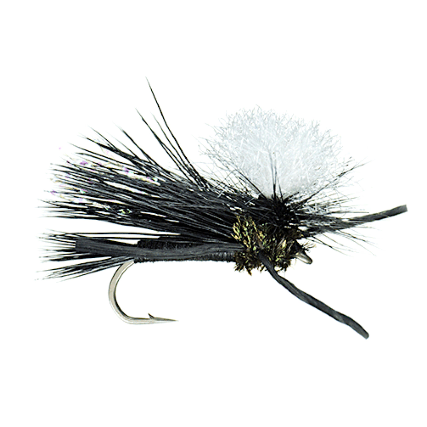 The para cricket attractor dry fly has everything - high-floating elk wing, a parachute post so you can see it, peacock herl, and rubber legs. It's a high-floater that you can see and the trout will grab. This is one of our most productive cricket patterns.