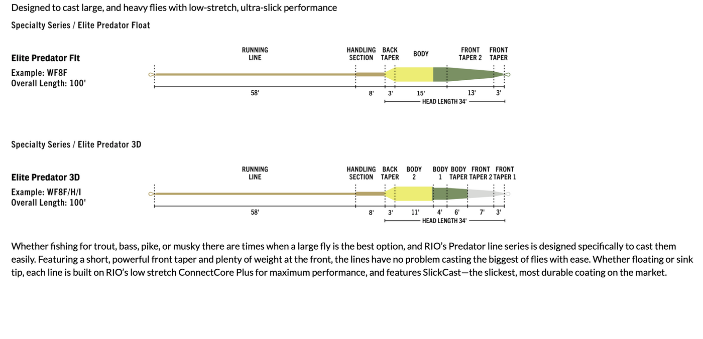 {"id":6622989484232,"title":"RIO Elite Predator Fly Line","handle":"rio-elite-predator-fly-line-1","description":"\u003cdiv class=\"mz-productdetail-shortdesc mz-l-stack-section\"\u003e\n\u003ch4 class=\"mz-l-stack-sectiontitle short-description-heading\n \n freshwater \n \n \n \n \n \n \n \n \n \n \n \n center\" itemscope=\"description\"\u003eDesigned To Cast Large, And Heavy Flies With Low-Stretch, Ultra-Slick Performance\u003c\/h4\u003e\n\u003c\/div\u003e\n\u003cdiv class=\"mz-productdetail-action-items sm\"\u003e\n\u003cul class=\"action-items\"\u003e\n\u003cli class=\"icon icon-arrow-bullet\"\u003e\u003cspan\u003eShort, powerful front taper to cast large and heavy flies\u003c\/span\u003e\u003c\/li\u003e\n\u003cli class=\"icon icon-arrow-bullet\"\u003e\u003cspan\u003eLow-stretch ConnectCore Plus for the best in performance and smoothness\u003c\/span\u003e\u003c\/li\u003e\n\u003cli class=\"icon icon-arrow-bullet\"\u003e\u003cspan\u003eBuilt with RIO's exceptionally slick, durable SlickCast\u003c\/span\u003e\u003c\/li\u003e\n\u003cli class=\"icon icon-arrow-bullet\"\u003e\u003cspan\u003eFeatures RIO's SureFire tricolored measuring system for increased accuracy and distance control\u003c\/span\u003e\u003c\/li\u003e\n\u003c\/ul\u003e\n\u003cp\u003eWhether fishing for trout, bass, pike, or musky there are times when a large fly is the best option, and RIO’s Predator line series is designed specifically to cast them easily. Featuring a short, powerful front taper and plenty of weight at the front, the lines have no problem casting the biggest of flies with ease. Whether floating or sink tip, each line is built on RIO’s low stretch ConnectCore Plus for maximum performance, and features SlickCast—the slickest, most durable coating on the market.\u003c\/p\u003e\n\u003cdiv\u003e\n\u003cbr\u003eThere are 4 different density lines to cover every fishing situation:\u003cbr\u003e\n\u003cul\u003e\n\u003cli\u003eA Full Floating line (F), for top water action \u003c\/li\u003e\n\u003cli\u003eA Floating Line with 10ft of \"Hover\" Sinking line, then 10ft of Intermediate Sinking line at the front (F\/H\/I), for fishing in the top 2-3 ft \u003c\/li\u003e\n\u003cli\u003eA Floating Line with 10ft of Intermediate Sinking line, then 10ft of Medium-Sinking line at the front (F\/I\/S3), for fishing mid-water \u003c\/li\u003e\n\u003cli\u003eA Floating Line with 10ft of Fast-Sinking line, then 10ft of Extra-Fast Sinking line at the front (F\/S5\/S7), for getting down deep and fast\u003c\/li\u003e\n\u003c\/ul\u003e\n\u003c\/div\u003e\n\u003c\/div\u003e","published_at":"2021-04-29T16:04:58-04:00","created_at":"2021-04-06T16:12:10-04:00","vendor":"RIO Products","type":"Fly Lines","tags":["Application_Bulky Flies","Application_Distance","Fly Line","Line Brand_RIO","Line By Species_Bass","Line By Species_Pike \u0026 Musky","Line By Species_Salmon","Line By Species_Steelhead","Line By Species_Trout","Line Weight_10 wt","Line Weight_11 wt","Line Weight_5 wt","Line Weight_6 wt","Line Weight_7 wt","Line Weight_8 wt","Line Weight_9 wt","Line_Freshwater","Sink Rate_Floating","Sink Rate_Intermediate","Sink Rate_Sink Tip"],"price":9999,"price_min":9999,"price_max":9999,"available":true,"price_varies":false,"compare_at_price":null,"compare_at_price_min":0,"compare_at_price_max":0,"compare_at_price_varies":false,"variants":[{"id":45362354651369,"title":"WF5F","option1":"WF5F","option2":null,"option3":null,"sku":"","requires_shipping":true,"taxable":true,"featured_image":null,"available":false,"name":"RIO Elite Predator Fly Line - WF5F","public_title":"WF5F","options":["WF5F"],"price":9999,"weight":0,"compare_at_price":null,"inventory_quantity":0,"inventory_management":"shopify","inventory_policy":"deny","barcode":"54651369","requires_selling_plan":false,"selling_plan_allocations":[]},{"id":40038825787592,"title":"WF6F","option1":"WF6F","option2":null,"option3":null,"sku":"","requires_shipping":true,"taxable":true,"featured_image":null,"available":true,"name":"RIO Elite Predator Fly Line - WF6F","public_title":"WF6F","options":["WF6F"],"price":9999,"weight":0,"compare_at_price":null,"inventory_quantity":1,"inventory_management":"shopify","inventory_policy":"deny","barcode":"730884194808","requires_selling_plan":false,"selling_plan_allocations":[]},{"id":40038825820360,"title":"WF7F","option1":"WF7F","option2":null,"option3":null,"sku":"","requires_shipping":true,"taxable":true,"featured_image":null,"available":true,"name":"RIO Elite Predator Fly Line - WF7F","public_title":"WF7F","options":["WF7F"],"price":9999,"weight":0,"compare_at_price":null,"inventory_quantity":1,"inventory_management":"shopify","inventory_policy":"deny","barcode":"730884194815","requires_selling_plan":false,"selling_plan_allocations":[]},{"id":40038825853128,"title":"WF8F","option1":"WF8F","option2":null,"option3":null,"sku":"","requires_shipping":true,"taxable":true,"featured_image":null,"available":false,"name":"RIO Elite Predator Fly Line - WF8F","public_title":"WF8F","options":["WF8F"],"price":9999,"weight":0,"compare_at_price":null,"inventory_quantity":0,"inventory_management":"shopify","inventory_policy":"deny","barcode":"730884194822","requires_selling_plan":false,"selling_plan_allocations":[]},{"id":40038825885896,"title":"WF9F","option1":"WF9F","option2":null,"option3":null,"sku":"","requires_shipping":true,"taxable":true,"featured_image":null,"available":true,"name":"RIO Elite Predator Fly Line - WF9F","public_title":"WF9F","options":["WF9F"],"price":9999,"weight":0,"compare_at_price":null,"inventory_quantity":1,"inventory_management":"shopify","inventory_policy":"deny","barcode":"730884194839","requires_selling_plan":false,"selling_plan_allocations":[]},{"id":40038825918664,"title":"WF10F","option1":"WF10F","option2":null,"option3":null,"sku":"","requires_shipping":true,"taxable":true,"featured_image":null,"available":true,"name":"RIO Elite Predator Fly Line - WF10F","public_title":"WF10F","options":["WF10F"],"price":9999,"weight":0,"comp